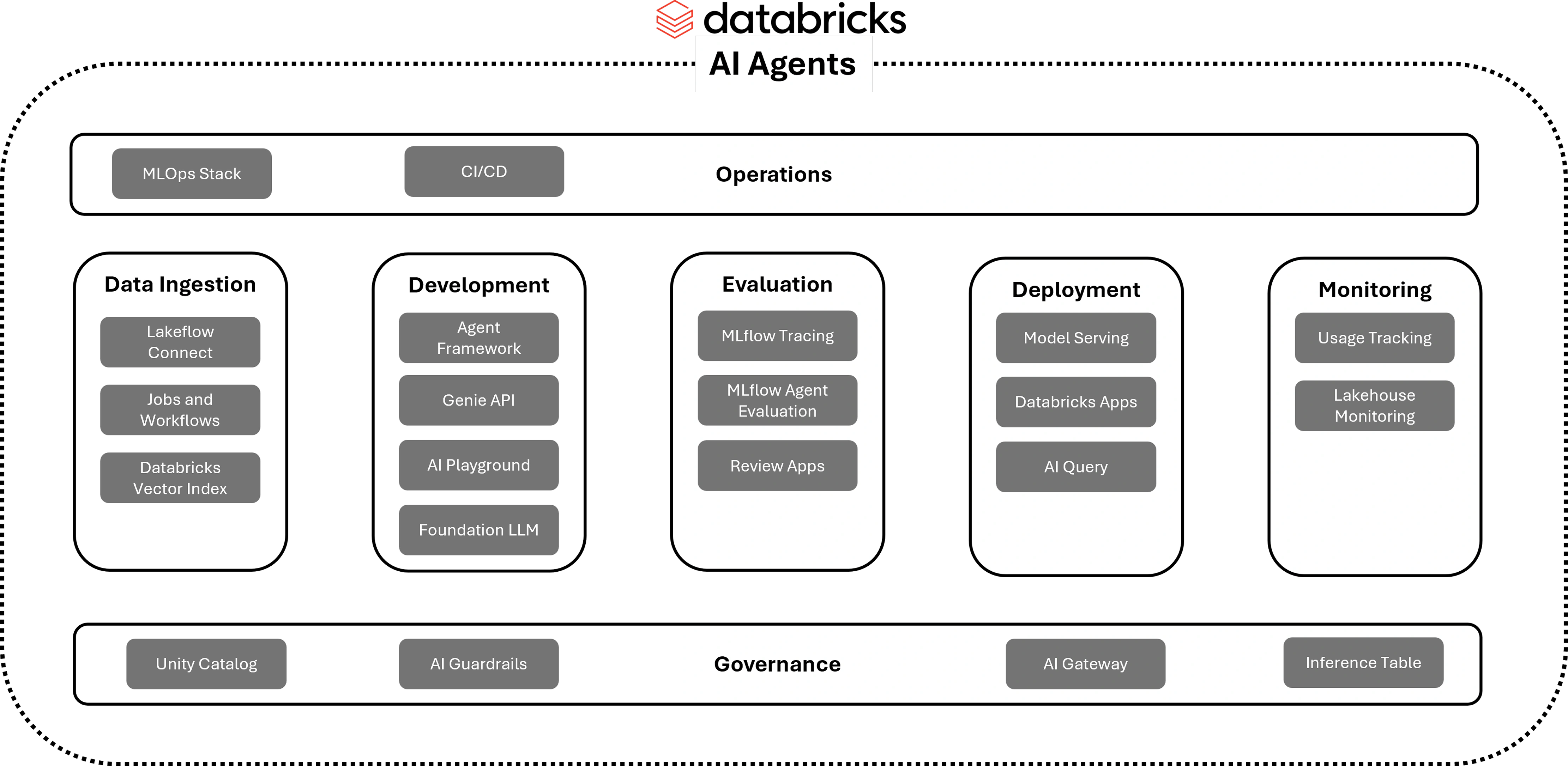 Modern platforms like Databricks offers a comprehensive, end-to-end MLOps framework for building, deploying, and maintaining AI agents. The core process flows through five key stages: Data Ingestion, Development, Evaluation, Deployment, and Monitoring. This lifecycle is supported by a foundational Governanace layer, which includes Unity Catalog, AI Guardrails, and AI Gateway to ensure security and control, and is streamlined by an overarching Operations layer that handles CI/CD and the MLOps stack. Essentially, it shows how Databricks provides an integrated environment to manage the entire AI agent lifecycle, from preparing data with Vector Index to developing with foundation models, evaluating with MLflow, serving models, and monitoring their performance in production.