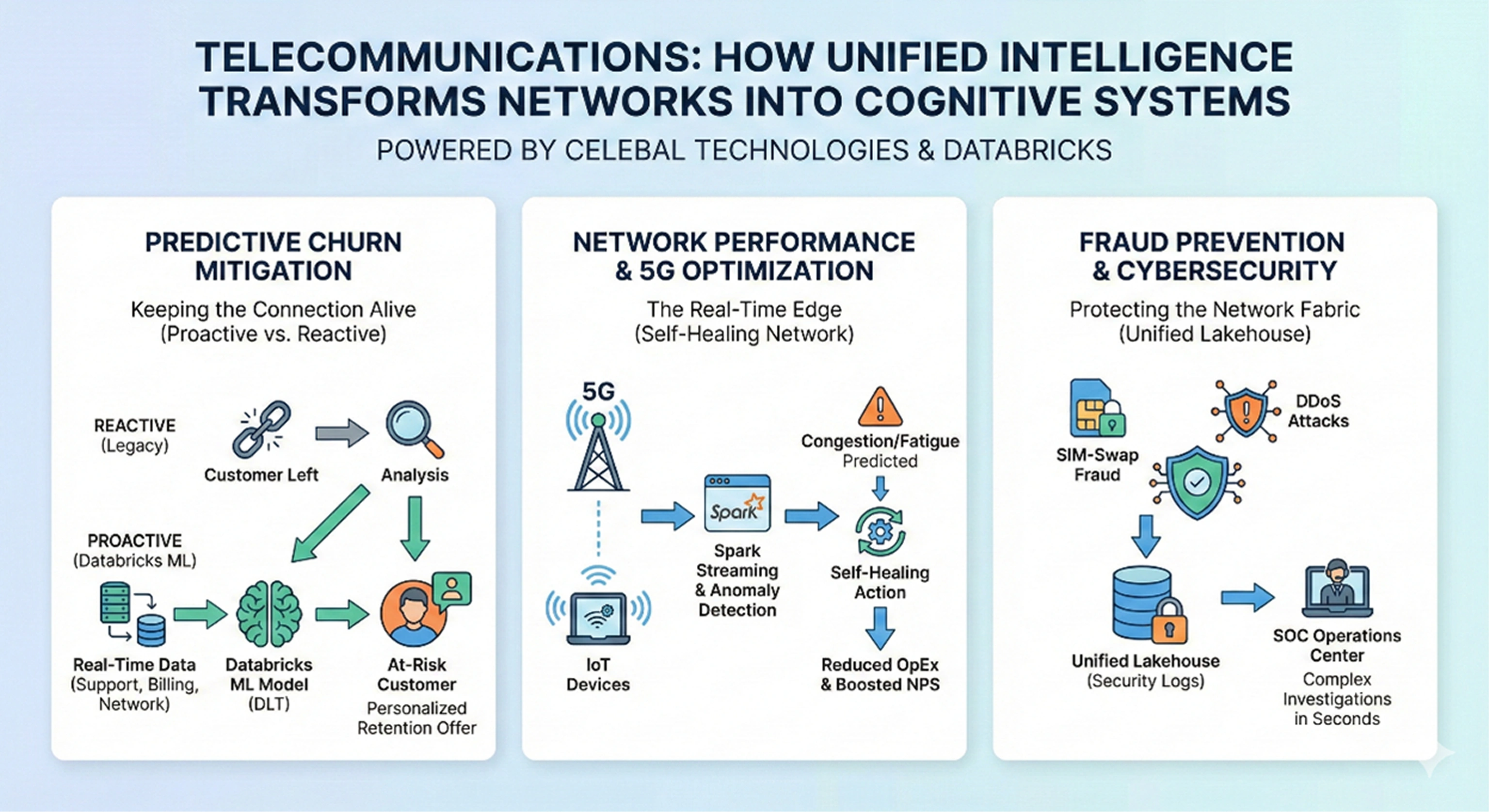 Telecommunications networks are prime targets for SIM-swap fraud and DDoS attacks. Celebal Technologies integrates Databricks with advanced cybersecurity frameworks to monitor network traffic for malicious patterns.